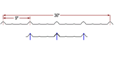 The screw line system (also referred to as nail line panel) is the most economical standing seam roof type that does not require fasteners penetrating the panel and has the same appearance of the snap lock. The rib measures 1 " high, panels are 26 gauge galvalume steel with an Kynar finish. This roof is usually found on industrial buildings, warehouses, and other large commercial buildings. Its price falls between that of corrugated and standing seam roofs. The key to the great value in this product is a combination of thinner gauge metal, and the use of a slotted fastener hole in lieu of a separate clip. This allows for a quicker installation and lower overall labor and material cost. The panel featured in the above photo has the striation option which are tiny bends in the flat of the metal that hide oil canning (wrinkled looking).
